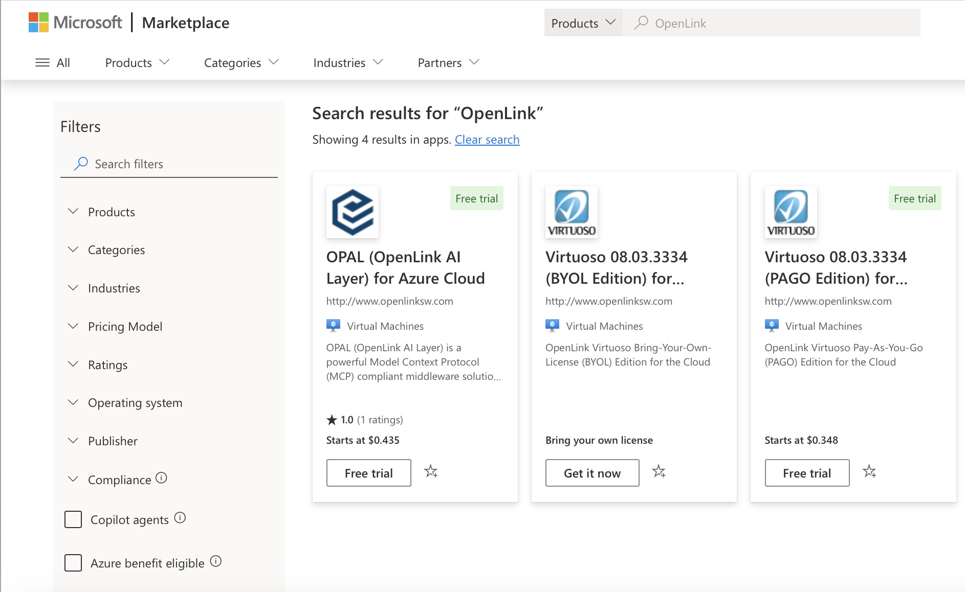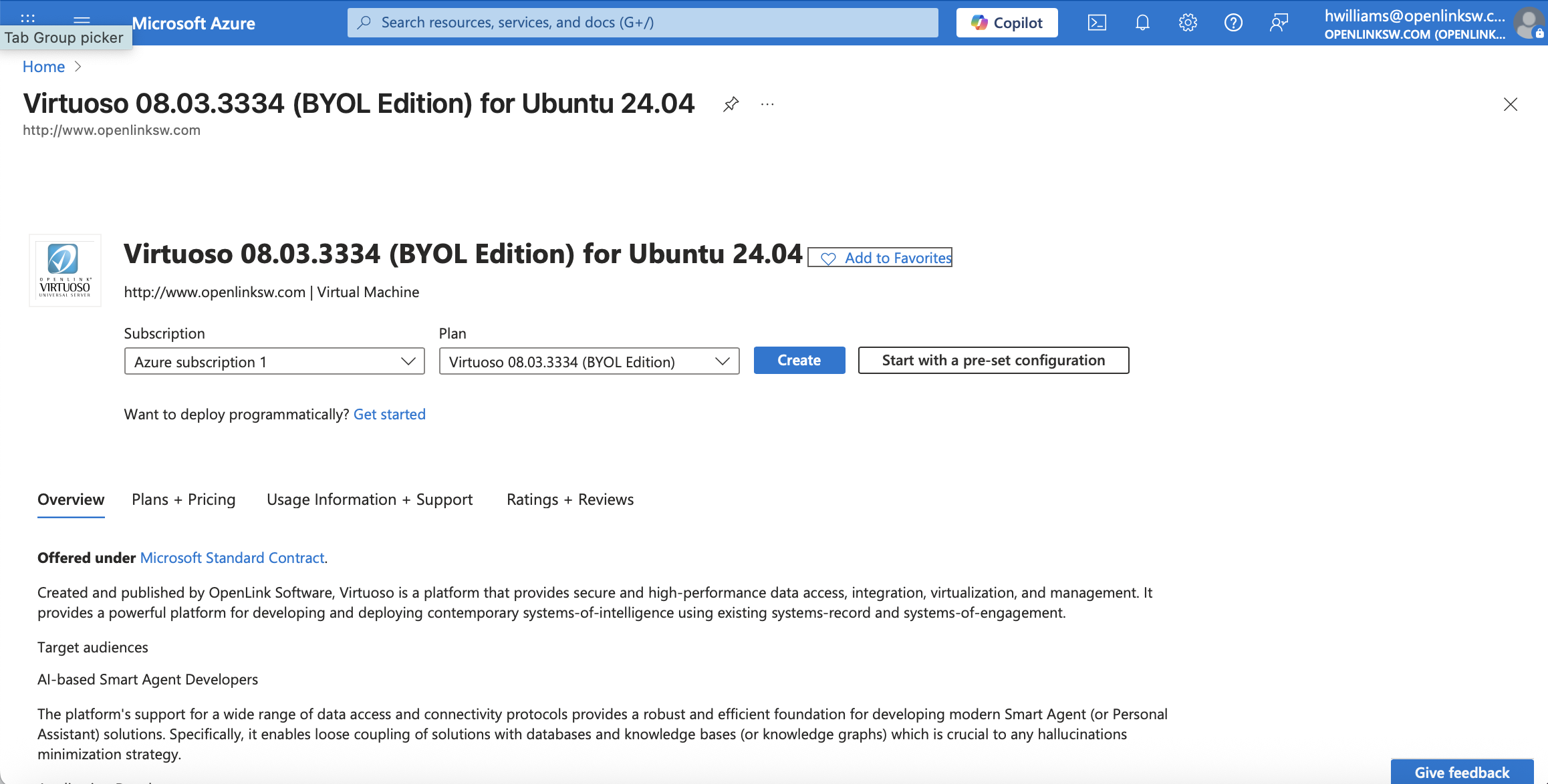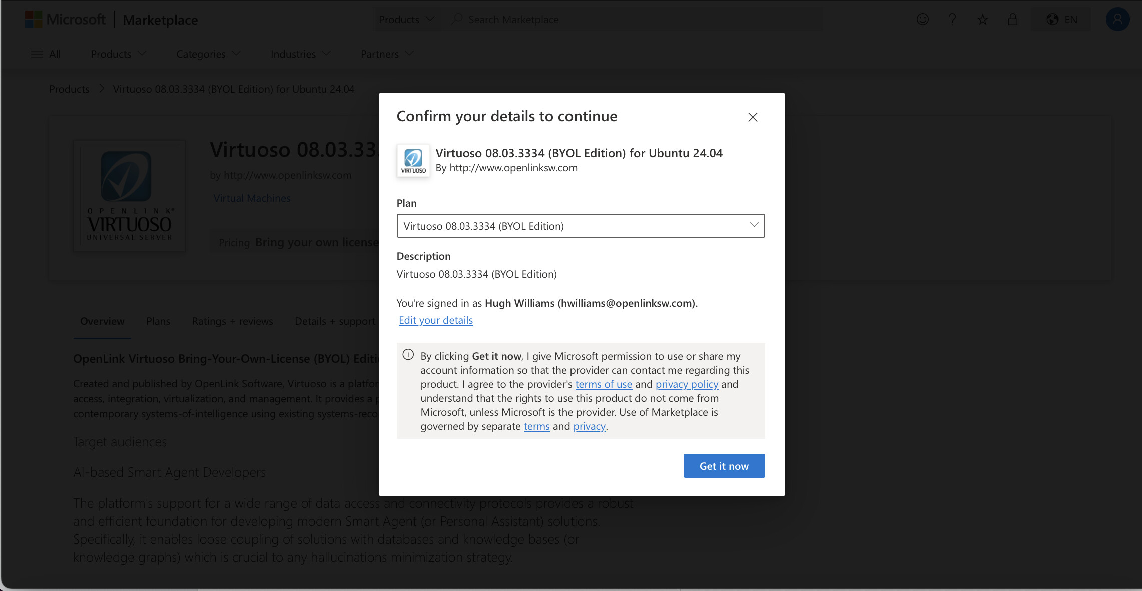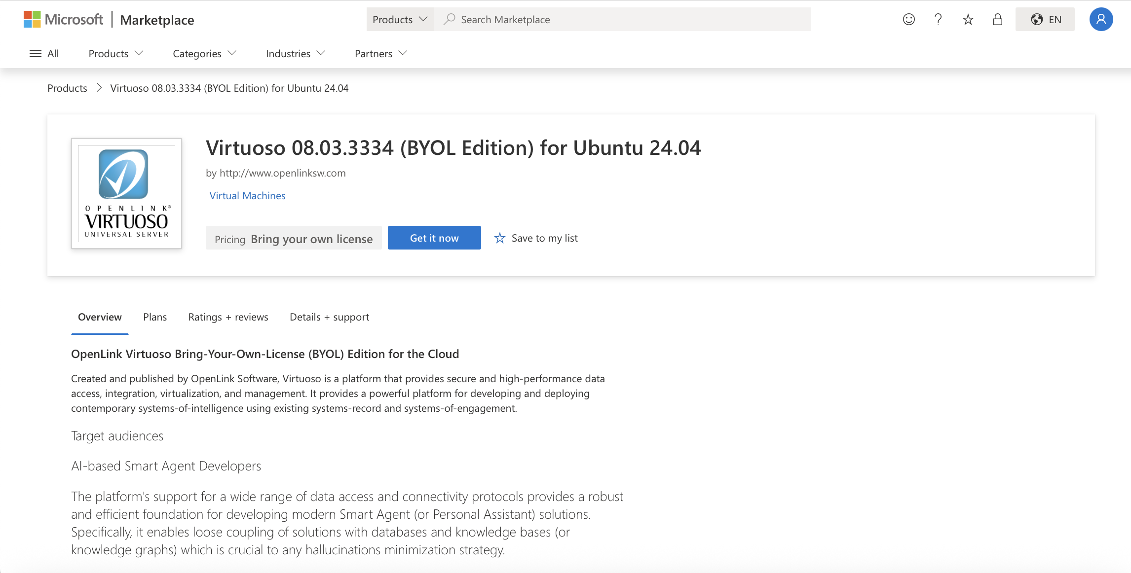 OpenLinkorVirtuosoto locate the available Virtuoso offerings and select the BYOL offer: